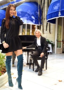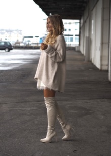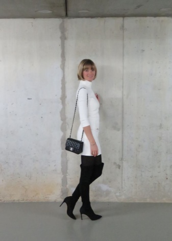 Tight-fitting suede boots will perfectly complement the little black dress that, according to Coco Chanel, should be in every woman’s wardrobe. At the same time, the hem of the dress should reach or slightly cover the edge of the bootleg of the stocking boots. Gold jewelry will add brightness to this image, as well as a bag and a belt of bright colors.