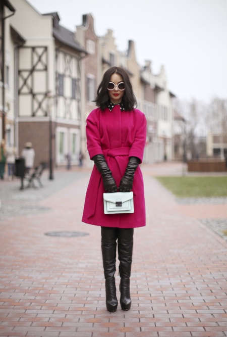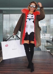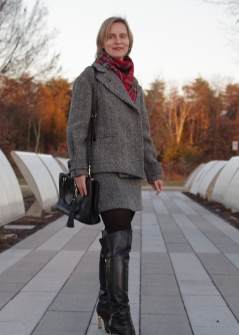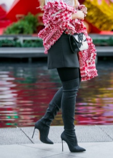 Truly, a combination of boots with various skirts will be feminine. For example, high black boots with a gold toe, a straight skirt to the knees of a shade of graphite and a red jumper. A small black handbag edged with gold will help to complete the picture.