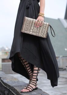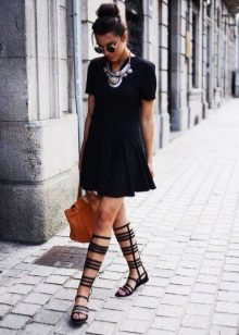 Another summer boots are gladiators. Knee-length with many interlocking straps, they look very stylish. Especially in combination with short skirts, shorts or dresses. The main thing is not to combine summer black boots with tights denser than 8-10 den.