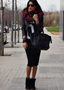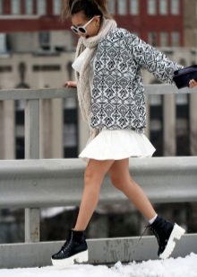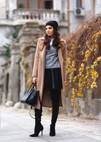 Pair black boots with a tractor sole and a pair of tight tights in tandem. With a successful combination, they can be worn in the office. It should be noted that black boots with tights in tone will visually lengthen the legs.
