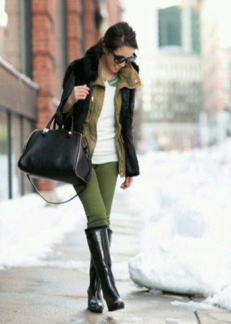 Patent leather boots are distinguished by the fact that they themselves attract attention. Therefore, when conscious of the image with them, clothing should choose neutral or simple. A suitable option would be cotton, wool or cashmere.