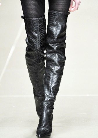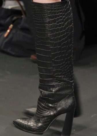 The reptile theme has been going on for several seasons. Pressing the skin under the snake and crocodile It is presented not only as the main material of the boots, but also often covers heels. Models from such material will look more successfully in natural and natural colors. Black is no exception.