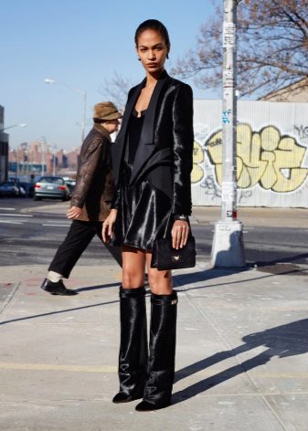 It is a very common mistake to choose a belt or bag of the same texture to varnish boots. Stylists advise not to abuse the gloss in the image and select at least accessories to varnish boots. Also, do not combine them with silk, guipure, satin.