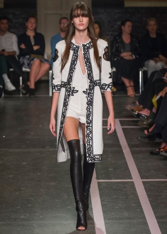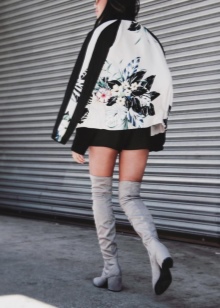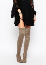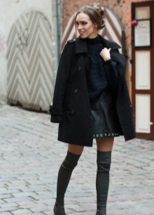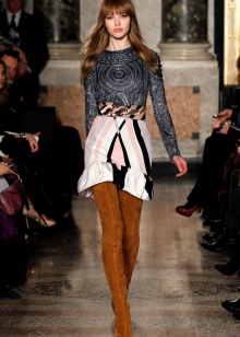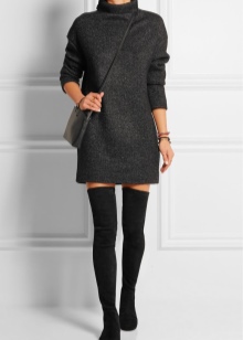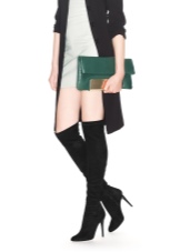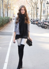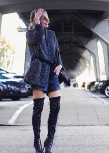 Skirts with a mini length, as well as short dresses or tunics will look just fine with such long boots. Shorts from various materials can also be attributed to this; they fit particularly well in the image of a classic cut shorts.