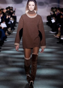 High-fitting shoes will look great with oversized things, that is, loose fit. Elongated sweaters, as well as tunics from light or dense fabric, are suitable. The image can be supplemented with a scarf or belt.