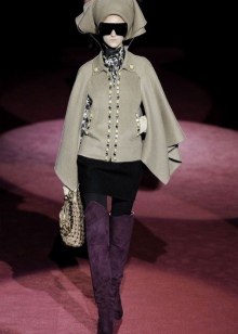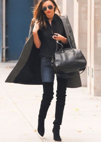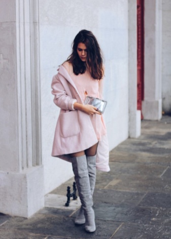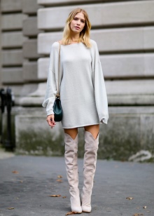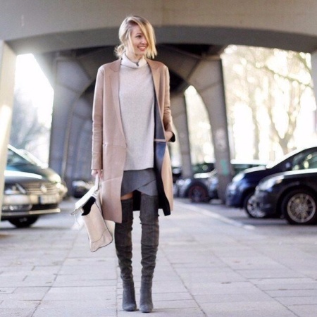 In gray boots you always look stern and attractive at the same time. The skirt is slightly above the edge of the shaft with a straight or asymmetrical hem, a white loose pullover, a beige coat and a handbag a tone lighter. The result was an image in the style of smart sexy.