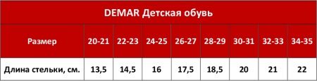 The size chart, which can be found on the official website of the Polish company, is presented as the ratio of the size and insole parameters. The necessary pair of shoes is easy to choose, focusing on the length of the insole of the product, and the double sizes of shoes allow you to buy boots for more than one season, even for fast-growing children.