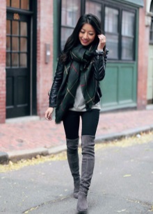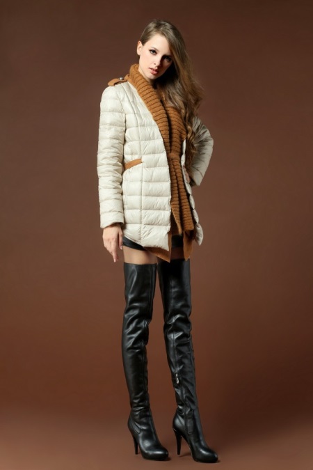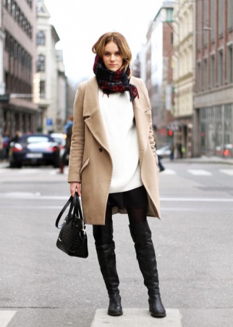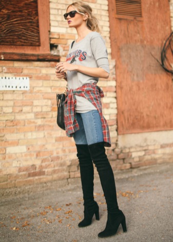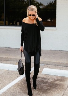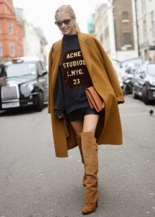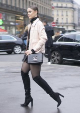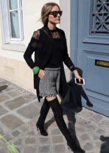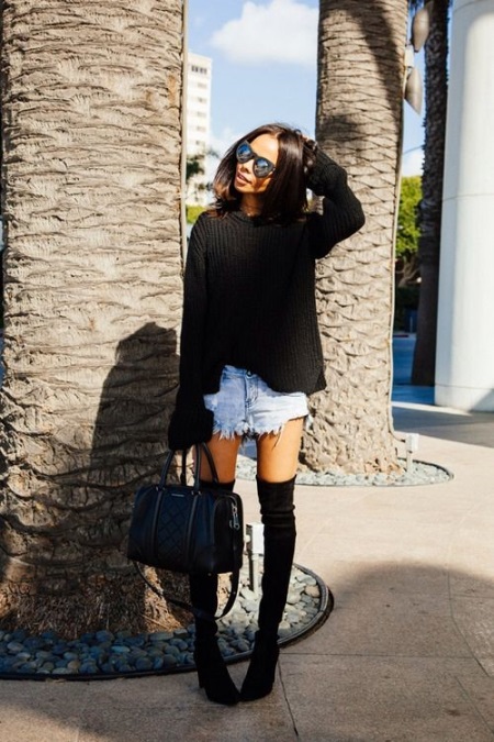 High boots with short shorts are a very risky combination, however, with a skillful approach, it will look very beautiful. Pick up dark shorts made of matte leather or suit fabric and wear them with tight, by no means corporal tights.