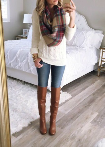 Jeans and boots are the most common combination that will be appropriate in everyday and urban looks. You can complement the image with a jumper, sweatshirt, shirt, blazer. In a word, there are no restrictions, a good solution for all time.