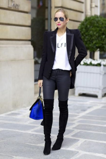A great example of how to wear stocking boots to work. Combine them with matching dark jeans and a sleek white t-shirt or shirt. Complement your look with an elongated black blazer and a bright blue roomy bag.