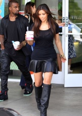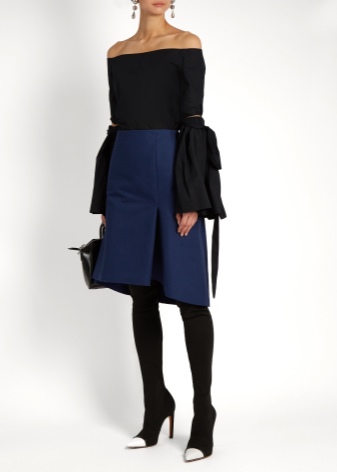 Thin stiletto high boots can be worn with an asymmetric skirt and black tunic, decorated with a bright floral print on the bottom.