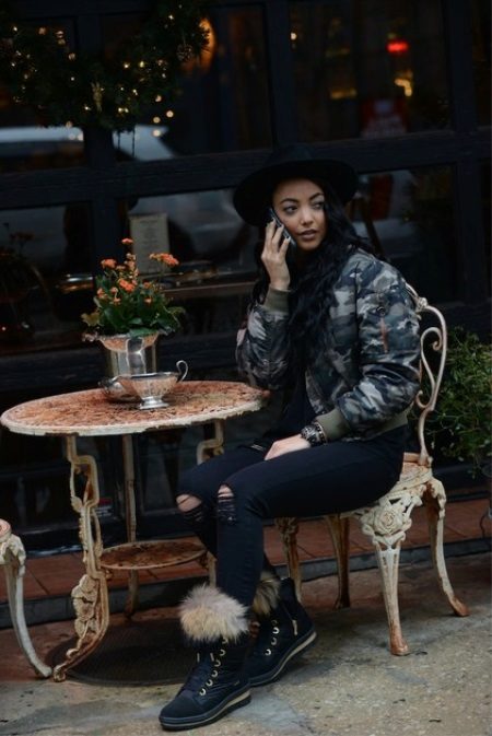 A fashionable and direct image, which contains a combination of deliberate rudeness and undisguised femininity. Stylish skinny jeans with gaps in their lap are a popular trend of the season, which is very well combined with a camouflage jacket and Jog Dog boots. In such an ensemble, you can easily get through the nearby shops and go to the rink without problems, but even go out into the countryside and take a walk in the rain. In any of these cases, you will certainly feel comfortable and warm, as this is exactly what Jog Dog boots are made for.