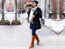 For urban style, you can wear classic boots with a flared skirt, an openwork pullover and a scarf with a print. The most spectacular will be the image with clothes of an emerald shade. An interesting and original ensemble will be a style with knitwear: elongated sweaters and short dresses. It is better to choose outerwear according to the color of shoes or lighter for a couple of tones.