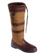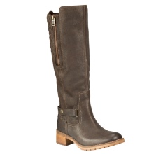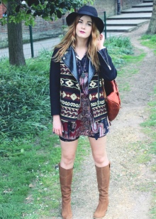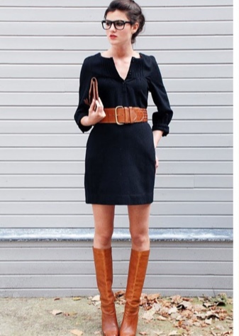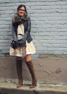 A combination of tall brown boots and a short dress.
