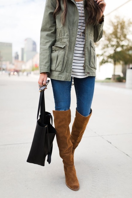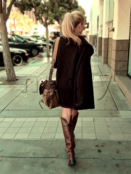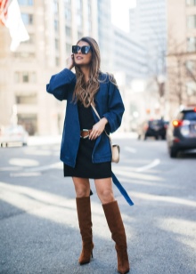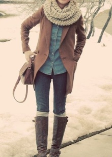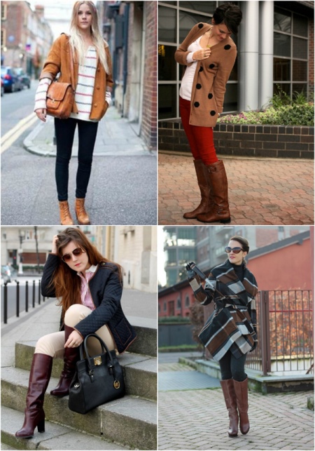 - The color of any type of outerwear (jacket, cardigan, sweater, fur coat, down jacket, coat or sheepskin coat) should overlap or match the color of brown boots;