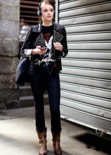If you combine cowboy dark brown snake-made boots with a black leather jacket in a biker style, you get a very daring image. It is enough to put on a undershirt with a bright print and dark tight jeans.