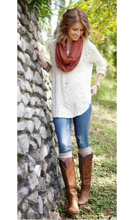A light white short-sleeved sweater is a nice outfit with classic blue jeans tucked in with tall brown boots. There are also high knee-high socks in the color of a sweater and a bright scarf around the neck.