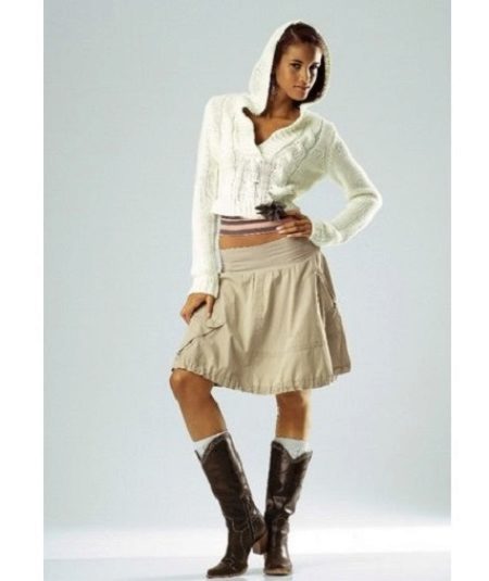 The skirt, perhaps, should not be lower than the knees, so as not to upset the proportions in combination with tall shoes.