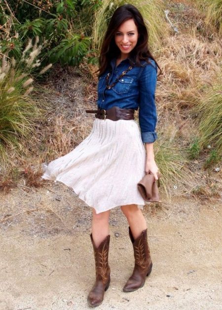 Classic romantic: denim dark blue shirt, tucked under a white loose skirt to the knee. Hazel-colored boots just below the knees. A thick belt and a clutch bag are matched to the tone of the shoe.