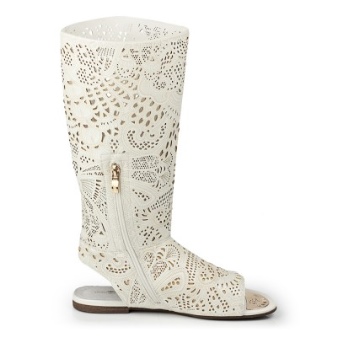 Boots with a wide top and open areas look good in combination with a chiffon dress, decorated with large flowers or an abstract pattern.