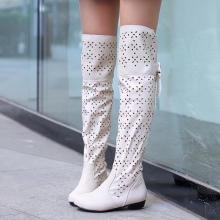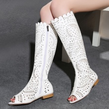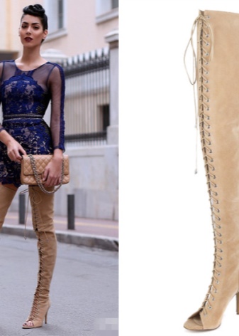 Sexy over the knee boots can have both a flat sole and a high wedge or heel. The most common and popular are models with an open toe and a mesh top. These boots will look great with light short skirts, shorts or light dresses.