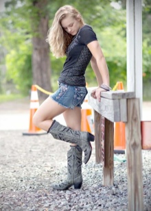 Perforated leather boots are called cowboy boots. Such shoes are distinguished by a pointed toe and a small steady heel. With such original models, skinny jeans or shorts and a plaid shirt will simply look fabulous. The shirt can be replaced with a plain light shirt. An interesting look is recommended to complement with a brown leather jacket (in cool weather).
