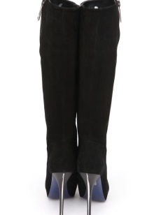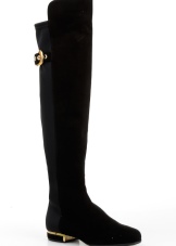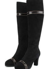 High winter boots with medium stable heels made of black or brown suede look unusually noble and premium. The only decor for a pair of shoes is the brand logo, laid out of rhinestones and edged with lines and leather inserts. Strict and laconic forms of boots-pipes will allow you to combine the ensemble with any clothes and accessories.