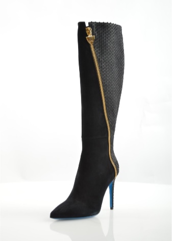 Some models are decorated with contrasting colors and textures of materials. It can be a combination of black and gray, connected by a diagonal zipper. The smooth black leather of the front is diluted with gray material with a relief in tone with the heel. The light golden runner with the brand logo is an accessory to luxury shoes and becomes the final touch of the design.
