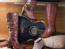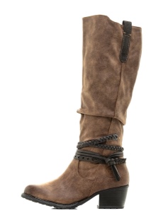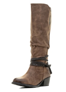 The brand offers fashionable women brutal high boots in the style of the wild west. The original shoes have a thick and wide heel and interesting details of the decor. Lift legs “hug” leather weaving and straps tied in knots. Such shoes will look very impressive with blue jeans and leather jackets in gray or red.