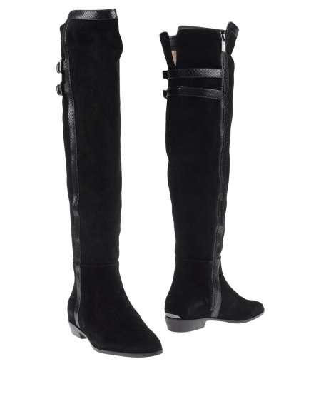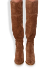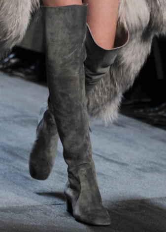 The brand produces feminine suede low-heeled over the knee boots. These shoes are decorated with thin lines with imitation of reptile skin along the entire length of the shaft. This unobtrusive detail visually lengthens the female legs and makes them more slender. The line of intersection of the heel and the back is complemented by the brand logo of the brand.