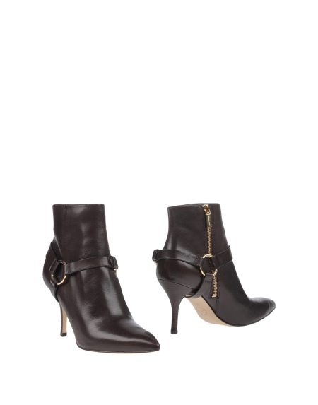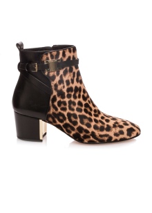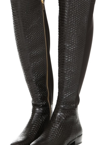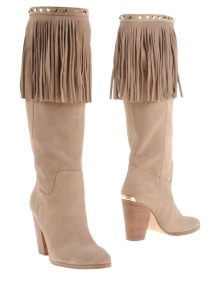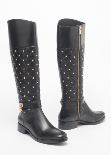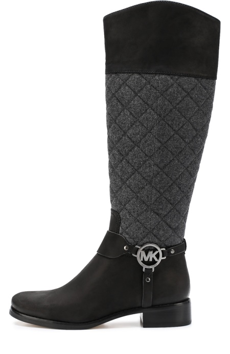 The fresh collection by designer Michael Kors has very original leather boots with large textile inserts on the top. These details are decorated with quilted ornament. The boots are equipped with a low and wide heel, an elongated nose and a trademark emblem on leather straps.