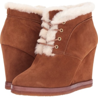 Suede low wedge boots look very gentle and flirtatious. On the rise of the products is placed a reliable lacing, complemented by a furry. Especially spectacular and rich look models of delicious caramel color.