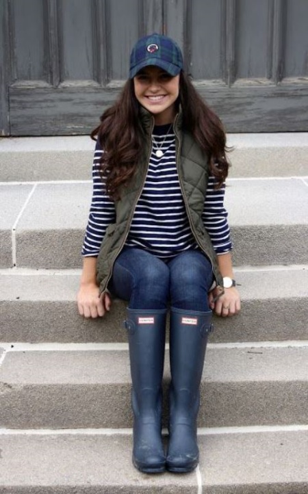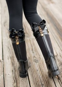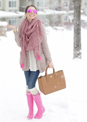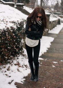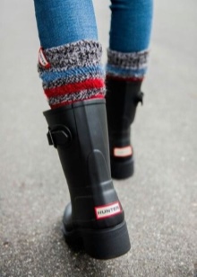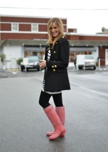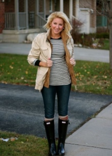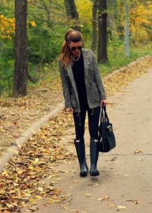 One of the most interesting and stylish additions to rubber boots. It can be denim, leather or textile mini shorts. It’s good if the boots are the same color as a T-shirt, top, turtleneck, shirt or shorts themselves.