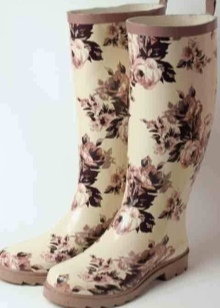 Prints for decorating rubber boots can be very different: peas, cage, strip, floral ornament, imitation under the skin of a leopard, tiger or zebra. There are more unusual options: animals, a brick wall, oriental ornaments, unusual inscriptions. To make such boots look even more spectacular, they must be worn under clothes that are designed in modest, restrained colors.