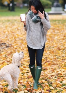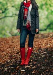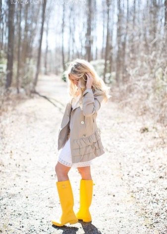 Bright boots look great with the same bright trench coat, shortened coat, light windbreaker. To create a more rigorous look, the usual options for demi-season coats, cloaks, and jackets are suitable. To make the image look more interesting, the restrained coloring can be diluted with a bright belt, a neckerchief, an umbrella. Boots for everyday life can be made in classic colors, have a light, discreet print.