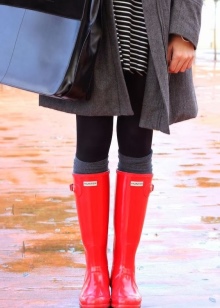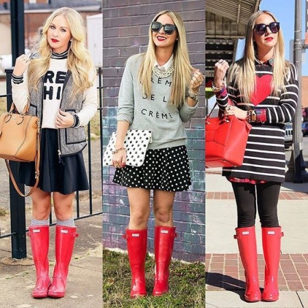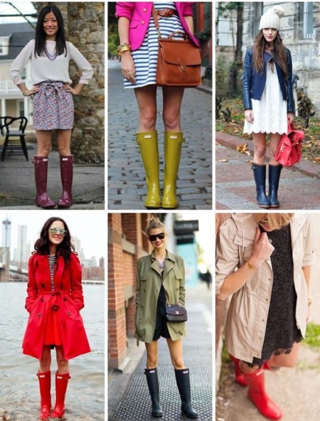 With different models of rubber boots skirts with a smell, flared, year, pleated, bell, balloon will harmoniously look. That is basically a fluffy, voluminous skirt. But, with neat, narrow boots, a medium-length pencil skirt will also look great.