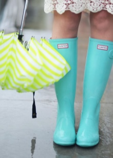 Bright rubber boots will help to make the image truly memorable. Colored, light, sunny models instantly transform the most boring everyday look and give a sea of positive emotions. Boots can be monochrome, combination or print. As a decor, a bright, contrasting finish is used: lapels, lacing, straps, sole.