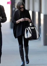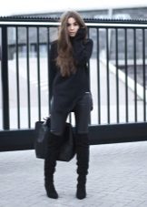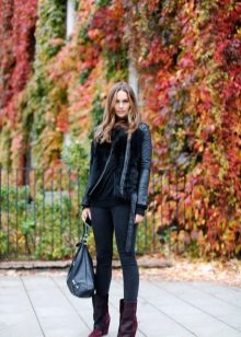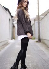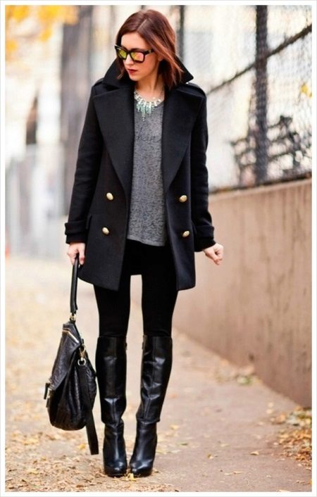 This look is suitable for work or for everyday wear, it is both concise and stylish. Black leggings, a gray jumper, a black cropped coat and black leather boots. A capacious bag and sunglasses complement the look. The decoration is an unusual necklace that attracts attention.