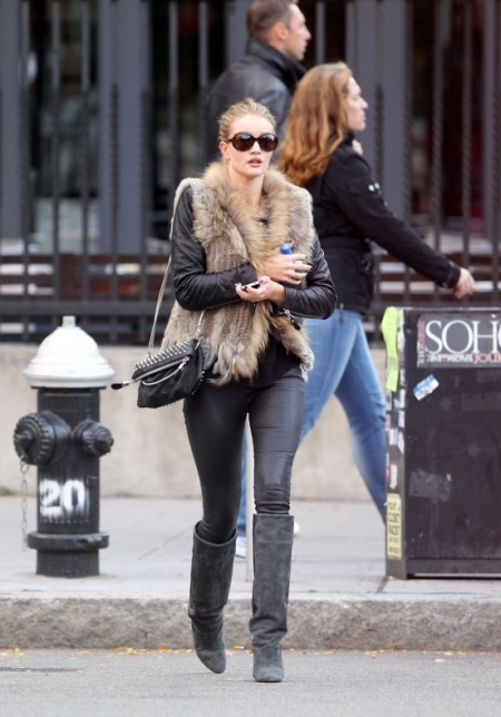 High pairs of shoes can be worn with a long coat of a straight silhouette. Boots made of matte leather look harmonious in combination with tight black trousers and a short light fur coat.