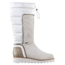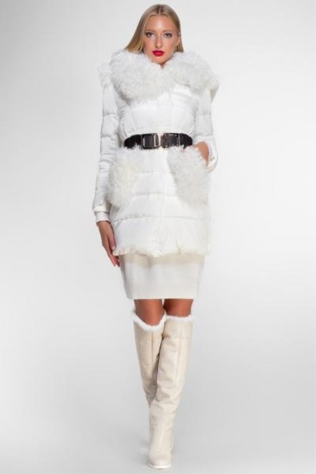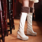 Feminine snow-white boots on a wedge heel with grooved soles can be worn during the first frosts. It is better to combine shoes with a white short fur coat of a shortened type. Shoes have a light, concise design, suitable for everyday wear. In it you can go for a visit, in a cafe or in the park for a walk.