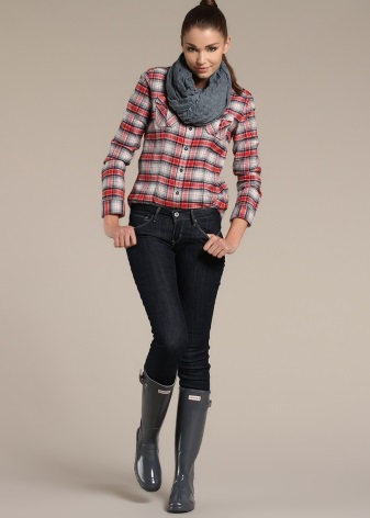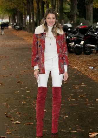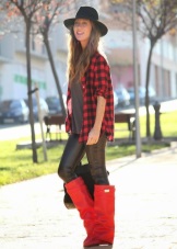 Red boots will become the brightest spot of a fashionable image. The rest of the surroundings can be selected in a lowly color. All the same, a bright emphasis on legs and shoes will attract everyone's attention. They can make up a company unless a red scarf or a handbag in tone.