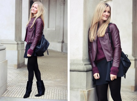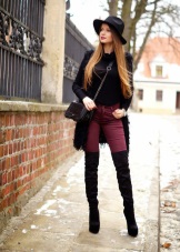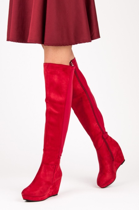 Burgundy wedge boots look bright and extravagant on young fashionistas. Shoes can be combined with carrot or brown clothes, lilac tones.