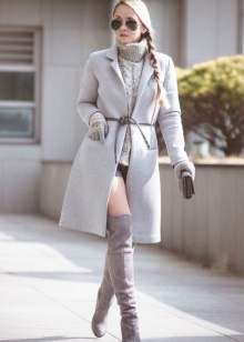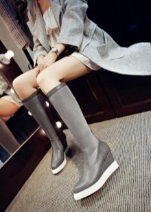 Gray wedge boots perfectly reflect the business style of clothing. A business suit, strict skinny pants or a straight skirt will be a great complement to each other. Jackets or coats of bright colors — from purple to blue — will suit gray boots.