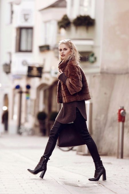 A fur coat made of mink fur with a knee length will look chic with over-the-knee boots or ankle boots with high heels. In winter, you don’t like wearing such shoes every day, so you can buy platform boots as an everyday option. Shoes should not stand out against the background of a fur coat and attract attention, so you can choose boots to match the color of the fur or dwell on a black model.