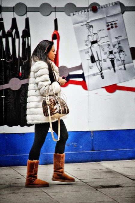 As for the shaft, it can be both tight and loose. Shoe style should be simple, devoid of flashy decor and sparkling elements. Previously, designers did not even consider the option of combining a fur coat with uggs, but such images are still included in everyday life. It is with a fur coat to the knee that you can shoe uggs, which can be made in the classic version or have a fur trim. But short boots in the image with such a fur product have nothing to do, because even long legs will seem short.