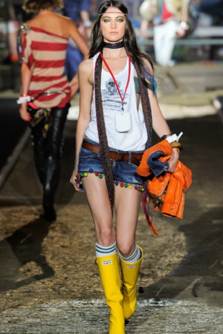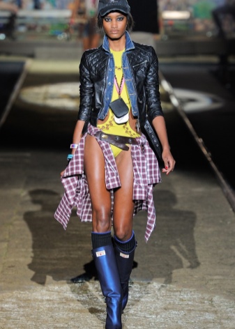 Another interesting combination with rubber boots will be denim shorts or other fabric.The boots for them should be chosen to match the chosen wardrobe, or you can combine denim shorts with yellow boots with heels.