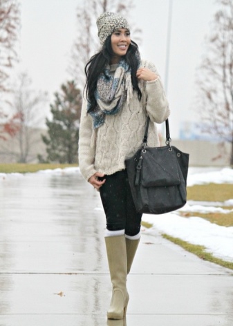 A win-win option in the image with rubber boots with heels will be jeans and tight-fitting trousers. This also includes leggings and jeggings that look great with rubber boots with a wide boot.