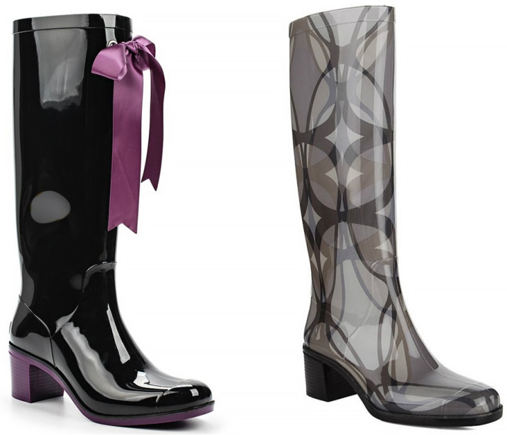 Some are experimenting with heels: they can be tall and thin, or medium and steady. Square low heels make rubber boots very comfortable.