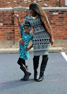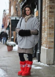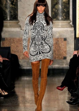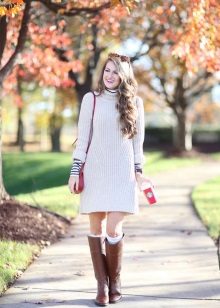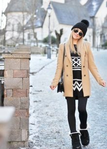 Knitted dresses with popular Scandinavian prints - deer, snowflakes and similar images look tender and cozy in combination with winter uggs and other comfortable boots. The length of the dress can be almost any - from mini to elongated midi, the main thing is that the distance from the top edge of the boots to the hem of the dress is at least 15 centimeters. For this ensemble it is worth picking up dense woolen tights from angora or cashmere, and then in this way you can safely walk along the snowy street of a winter city.