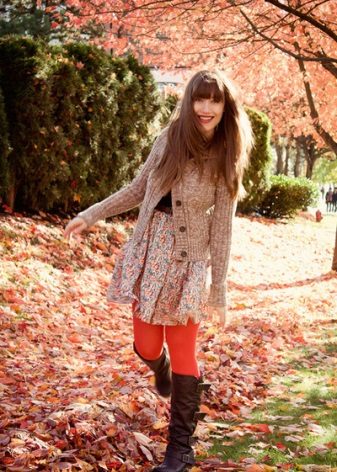 Their color is selected according to the color of shoes, not dresses. So, for example, black boots almost always look good with black tights. The only exception is ensembles in which the dress has enough light and warm tones - beige, ocher, khaki. These shades are recommended to wear flesh-colored tights that do not attract attention.